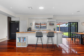 The centre of the home provides a stunning light filled open plan living and dining area, flowing into the decadent kitchen with its large centre island, solid wood benchtops, quality appliances, and polished hardwood floors. This elegant space is suited to casual meals, family gatherings, or entertaining.